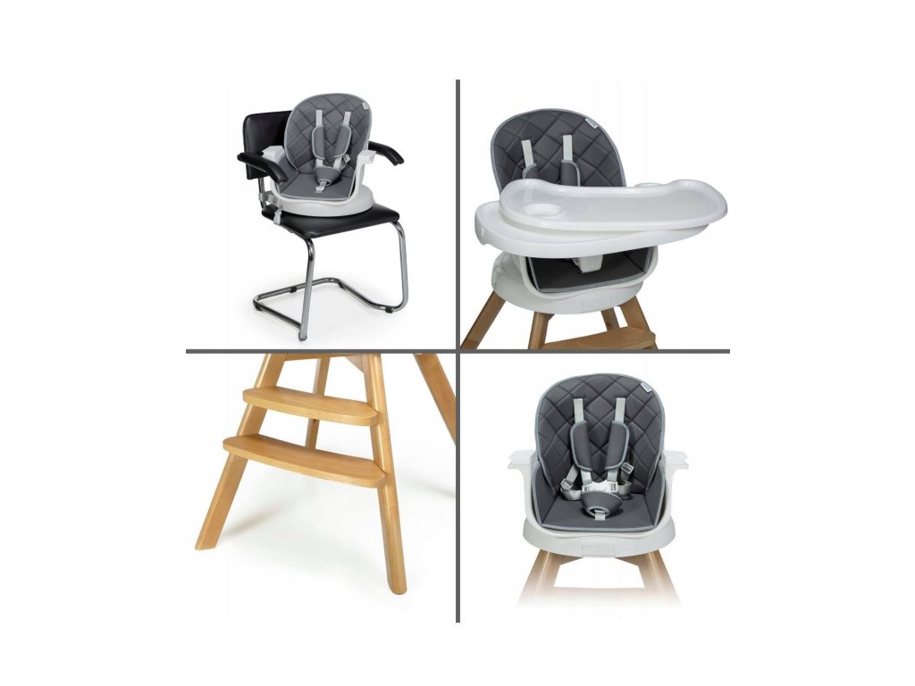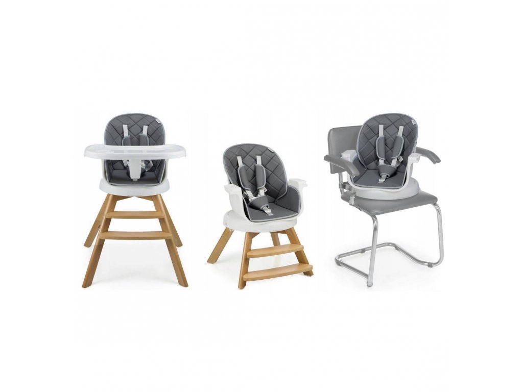 Kombinuje 3 funkce - vysokou židli a židli pro starší dítě a další židli, která je navíc vybavena otočnou podložkou.